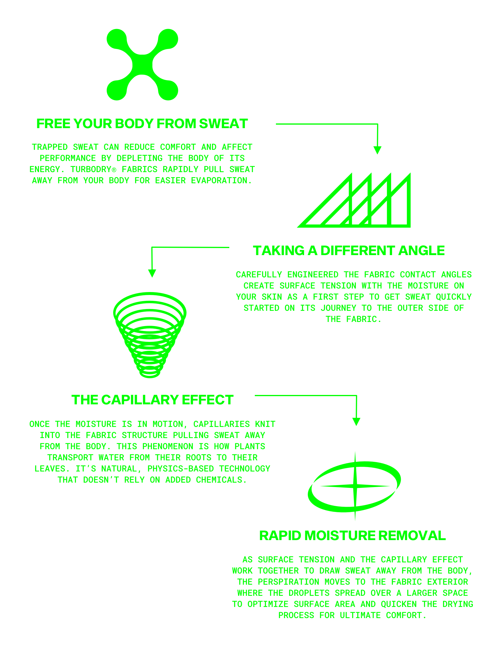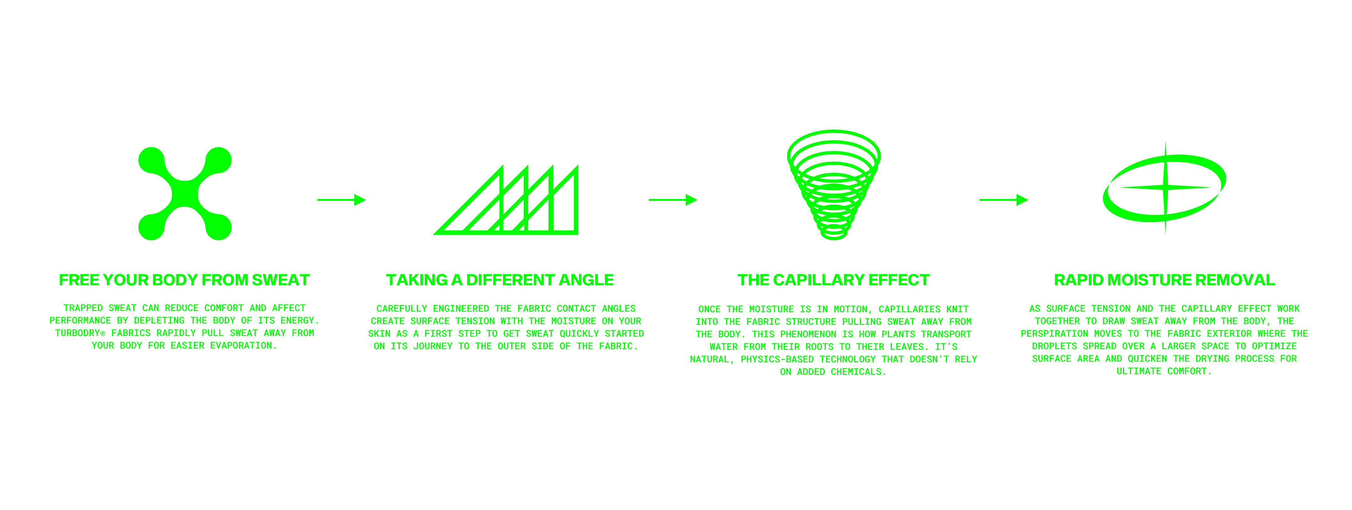 TurboDry® is one of the fastest drying fabric technologies that exists. This revolutionary fabric features a patent-pending technology that naturally transports moisture away from your skin. This is the TurboDry® difference.